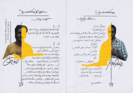 The exhibition shows three works: a handmade literary anthology edited and designed by Maher Sherif, a wall comic produced in collaboration by Aliaa ElGready, Maher Sherif and Ahmed Salem, and black and white portraits of the authors of the Iskenderiyan Standards anthology by Samuli Schielke. In the book, elaborately shaped collages and hand-colored illustrations give the poems, essays, and short stories (both in Arabic and English) a special character. The wall comic extends from right to left – the direction in which Arabic is read – through the second exhibition room in the style of a graphic novel, with literary texts, photographs, and passages from discussions in the course of their collaboration. With this site-specific work, the artists Maher Sherif, Ahmed Salem, and Aliaa ElGready narrate the story of a complex relationship with the European in Alexandria, a port city where North and South have always crossed paths.